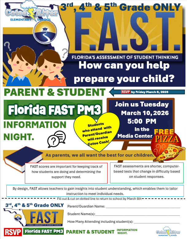 We hope that you will join us for our FAST Parent Night. You will learn how to help your child with PM3 testing. We will be having pizza and scholars can earn Cotee Cash for attending.